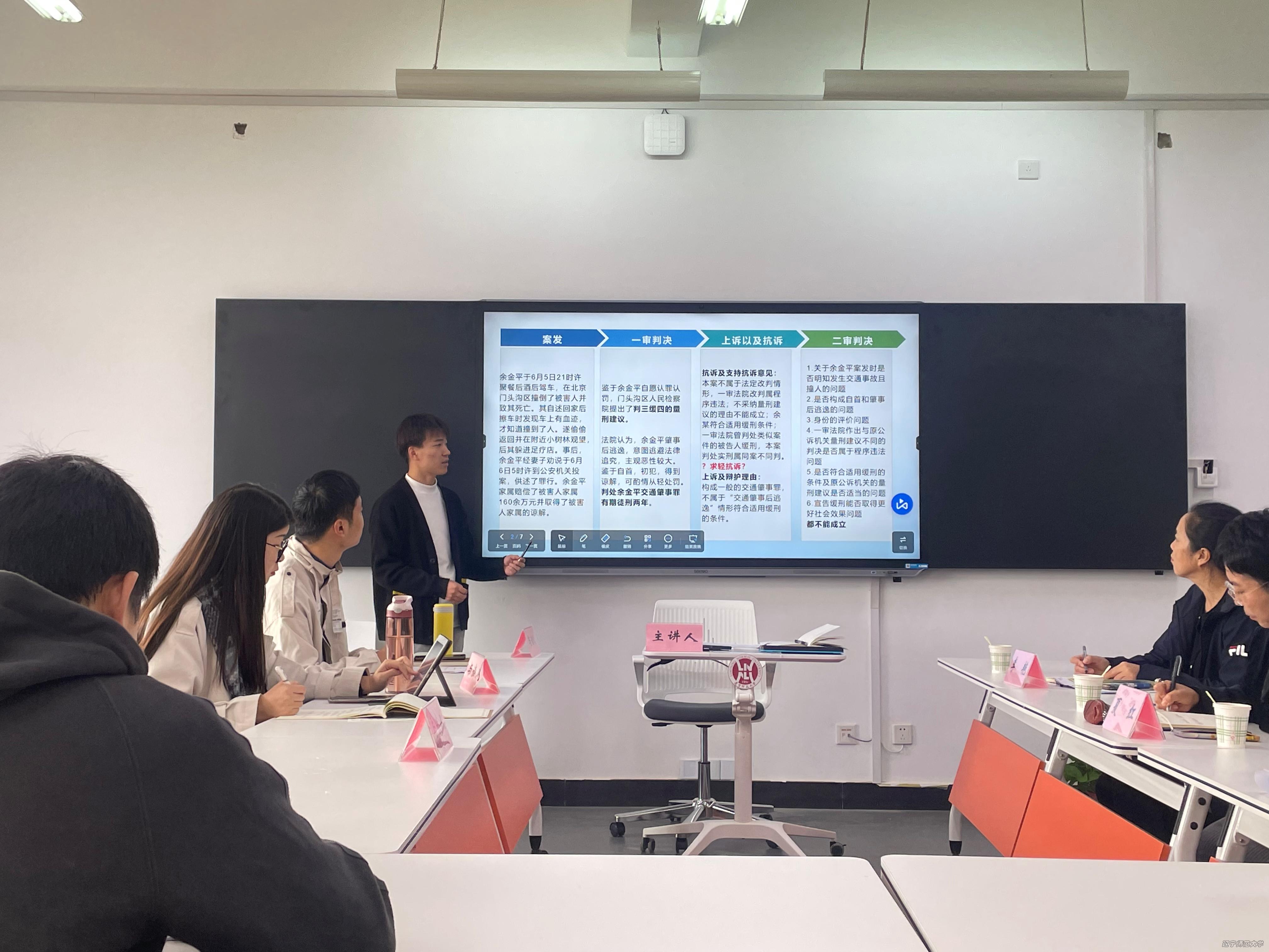 第一位贺智杰同学提出可以从比较法研究的视角来审视“认罪认罚从宽”制度下的余金平案。同时他还提出,该案不仅是实体法与程序法的结合,更是理论与实践的结合。但是我们的研讨不应只建立在理论层面,更应该结合实践来回答理论问题。第二位李宁祥同学从三个方面提出自己的见解。首先李宁祥同学认为检察机关的抗诉意见中将一审法院未采纳量刑建议表述为“改判”是值得推敲的。其次她认为认罪认罚案件较高的适用率已经凸显出了检察机关在该制度中强有力的主导性,是否还应继续强化检察机关的抗诉权值得商榷。最后李宁祥同学提出从比较法的角度来分析认罪认罚从宽制度的现实困境或许可以得出更多的有益经验。第三位与谈人房宇中同学认为余金平的判决结果“合法不合情”,该案中法律条文的适用是合理的,但是对于“认罪认罚从宽制度”的推广适用或许会产生一定的影响。随后朱帝坤同学对三位与谈人的提问和建议一一作出回应和交流。期间参加此次研讨会的高君桐同学对域外法律制度中是否以公平公正为前提提出疑问并与主讲人交流。