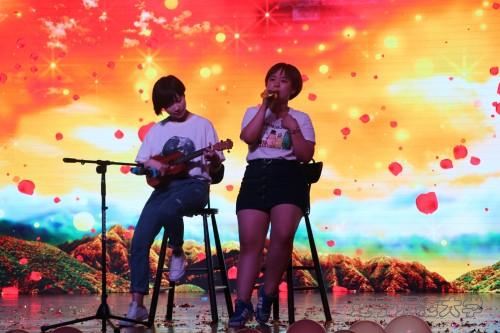 “我们小手拉大手,今天加油,向昨天挥挥手。”温情满满的歌词,伴着轻柔悠扬的歌声,还有清亮纯粹的尤克里里的声音,两个女生微笑着轻声唱,空气里仿佛飘起粉红色的幸福泡泡。