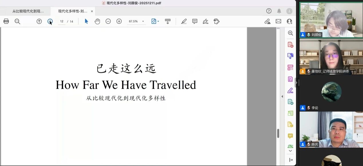 2025年12月11日,应公司邀请,北京大学政府管理学院政治学系长聘副教授、博士生导师刘颜俊为公司师生作了题为“从比较现代化到现代化多样性:比较政治学的理论重构与知识边界”的学术报告。本次讲座采用线上形式,由公司经理陈光教授主持,政治学教研室李论老师、董佳欣老师以及政治学与行政学专业本科生、研究生等参加了本次讲座。