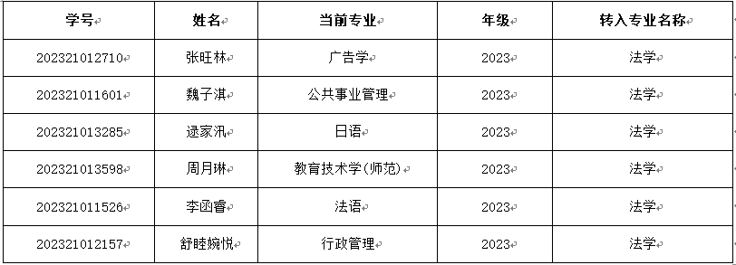 依据《yl7703永利集团官网2023级本科生转专业工作通知》及《yl7703永利集团官网法学院2024年度本科生转专业工作实施细则》,法学院转专业领导小组于2024年3月15日对申请转入公司的员工进行考核。经审核,拟接收以下6位同学转入公司法学专业学习,现予以公示。公示时间为2024年3月18日—22日,公示期间若有异议,可以致电或致函反映,反映应有事实根据,署真实姓名,联系电话:85827006。