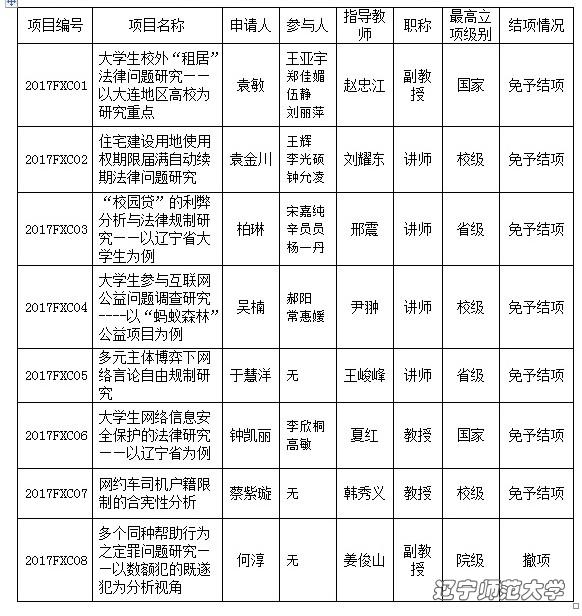 2017年法学院院内大创项目,共立项8项。在同学们的努力和指导教师悉心指导下,其中2项获批国家级、2项获批省级、3项获批校级老员工创新训练项目。经学院研究决定,达到校级以上的项目可以免予结项。其中有一项未能获批校级项目,经本人申请,同意撤销院级项目。