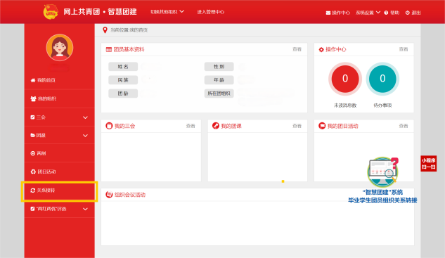 2、团员登录成功后,进入个人中心,点击左侧“关系转接”菜单,填写相关内容,具体填写内容如下: