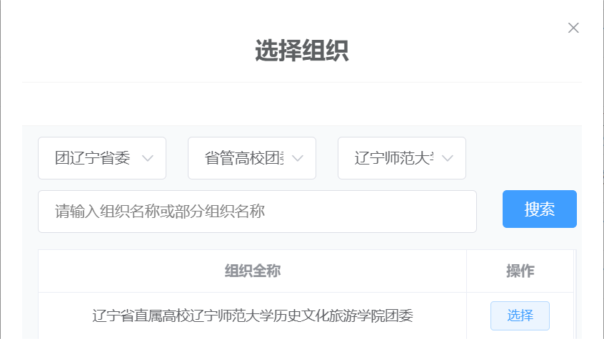 ③申请转入组织:点击选择“团辽宁省委”,“省管高校团委”搜索框内输入:“辽宁省省管高校yl7703永利集团官网yl7703永利集团官网”,之后在候选框中选择“yl7703永利集团官网2025级研究生新生临时团支部”