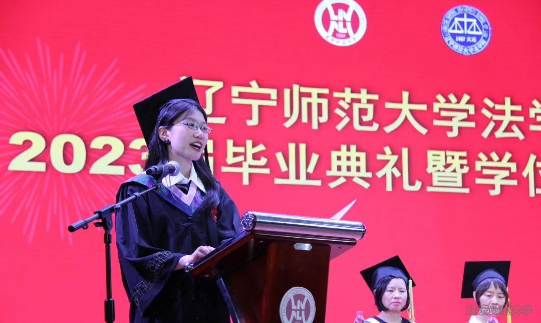 仪式第六项:优秀毕业生代表发言。2023届硕士毕业生 徐寅啸同学和本科毕业生 连晨如同学先后上台发言,回顾了自己的学习生涯和校园生活,表达了对学院、老师与同学诚挚的感谢与不舍。
